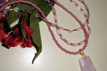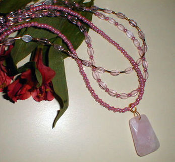 Rosequartz is a gemstone of the heart, lending openness and balance and grace. This feminine necklace features three strands on a gold tone three-strand box clasp. The longest strand of pink lustre seed beads is approximately 22 inches long. The remaining two strands of delicate 6x9mm pink glass are approximately 21" and 21.5." The facet-cut rosequartz pendant is about 1.5" long and 1" wide at the bottom.