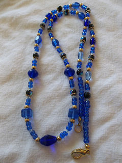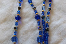 This collection of blue glass beads, accentuated with small gold beads, is approximately 26 inches long, including 1/2 inch gold lobster clasp.