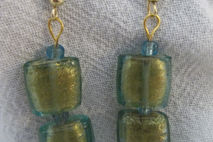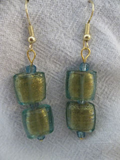 Delicate green blue glass 1/2 inch beads with golden interior highlights and separated by blue glass E beads. Approximate length from top curve of gold french hook is 2 1/4 inches.