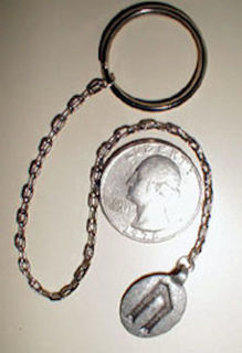 Special pewter rune pendulum; back of rune reads "Ur / endurance / power." Approximate length of pendulum from top of 1" split ring to bottom of rune is 8;" approximate length of rune is 3/4."