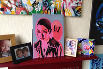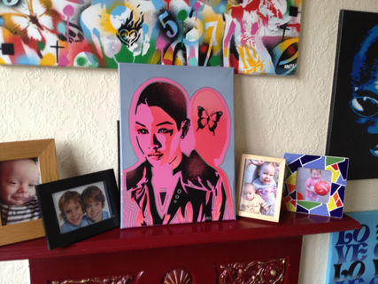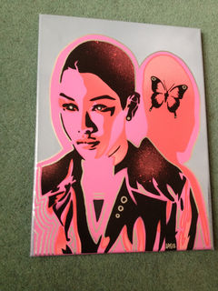 painting of android asian woman made with handcut stencils and spraypaints.