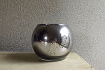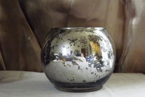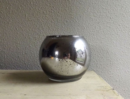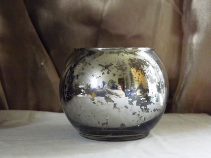 This round mercury glass vase or candle holder is hand painted and distressed for a mercury glass look. It is 4 inches tall, with an opening just over 3 inches in diameter.