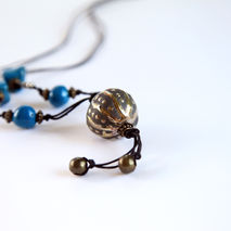 ceramic long necklace in raku pottery, gold, turquoise, ooak