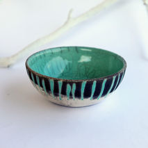 ceramic fruit bowl, raku pottery, mint white stripes, christmas